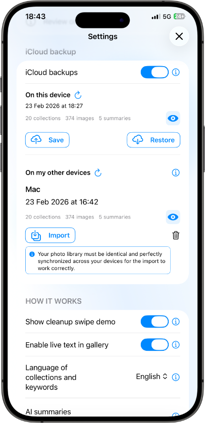 Swift development & advanced features: Led Swift development to build a robust architecture and intuitive native experience. Integrated advanced AI-driven features including semantic analysis across text and images, automatic tag generation, intelligent summarization, redesigned AI synthesis flows, SmartData extraction (dates, phone numbers, business references, and more), AI-powered reminder creation, SmartCollections with natural language rules, comprehensive data management, and seamless Photos app synchronization.